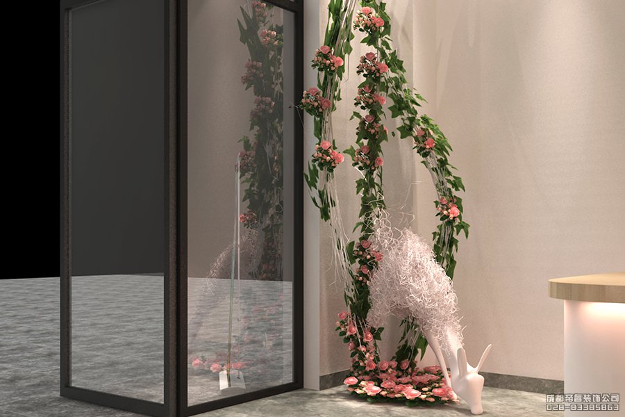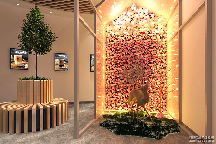 而在奶茶店休息區的另一角則是設計了一個獨立景觀空間,里面密密麻麻的裝飾著鮮艷花朵,再配以“白鹿”這種有著品牌意義的吉祥物,很好的詮釋了連鎖奶茶店鹿角戲這個品牌形象,同時也寓意著這是一家高端連鎖奶茶店。